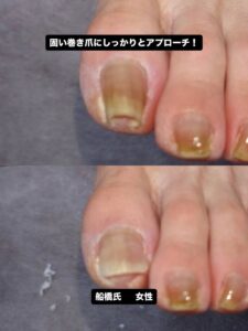 硬く巻いた爪を矯正し、改善への第一歩を踏み出しました。巻き爪の痛みは日常生活に大きな影響を与えますが、適切な施術により改善が可能です。船橋市で巻き爪の痛みに悩む方はぜひご相談ください。