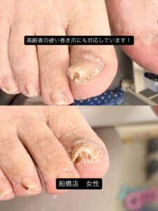 巻き爪の痛みは「年齢だから」「体質だから」と諦められがちですが、構造を整えれば改善可能なケースがほとんどです。船橋市で巻き爪による痛みを我慢している方、硬く変形した爪でお困りの方、歩くと痛みが出る方はぜひ一度ご相談ください。今回のように長年の巻き爪でも安全に矯正し、痛みの改善と形の回復を目指すことができます。巻き爪の痛みは我慢するものではなく改善できるものです。船橋市で同じ悩みを抱えている方の参考になれば幸いです。